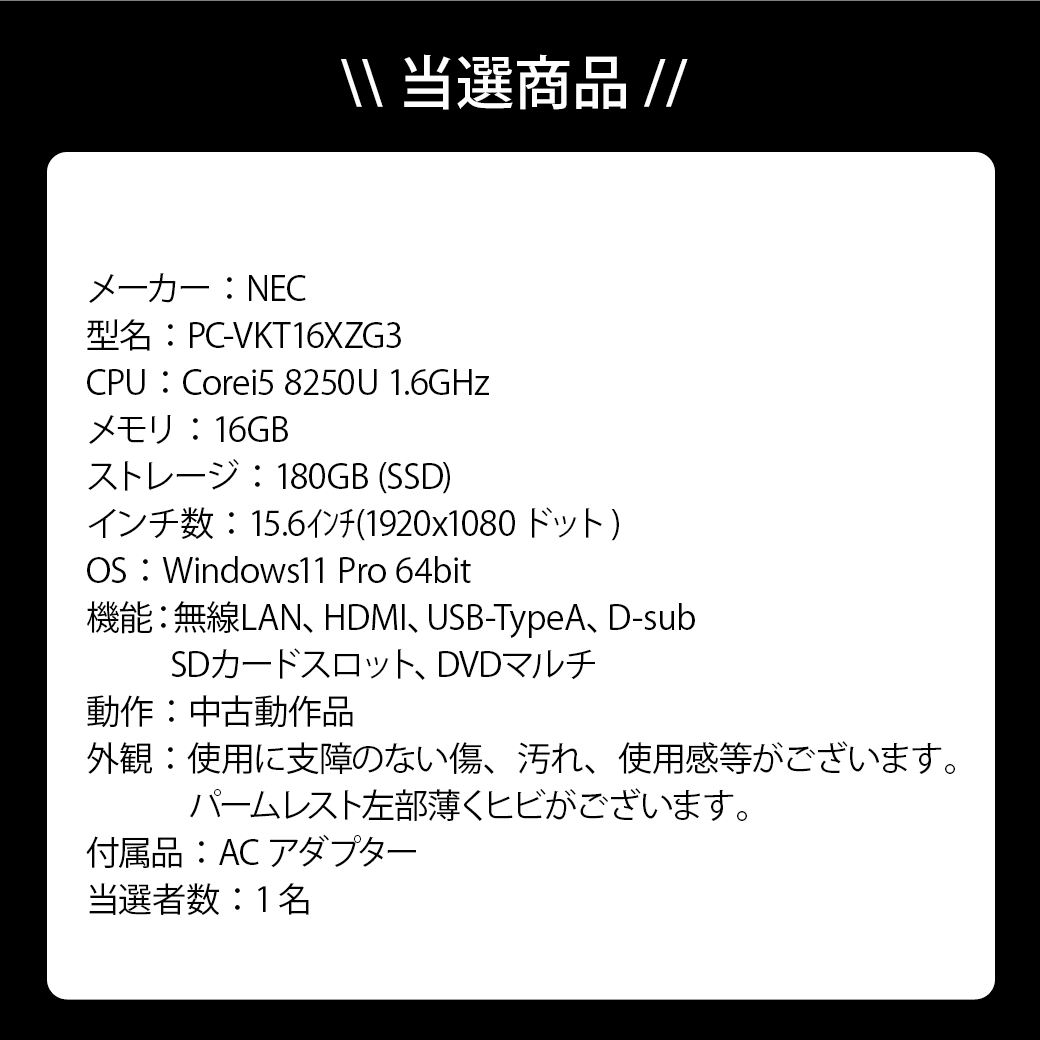 条件達成で中古 NEC PC-VKT16XZG3を1名様にプレゼントします。