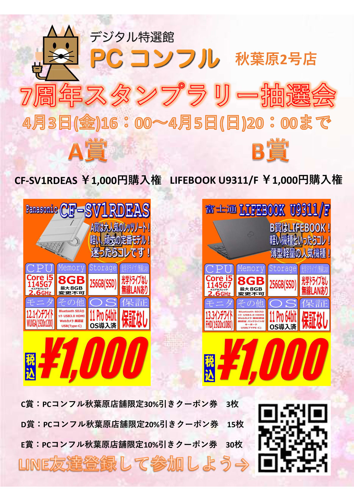 A賞・B賞(各1名様)は、当店指定の人気軽量ノートPCを1,000円(税込)でご購入いただけますので、お見逃しなく!