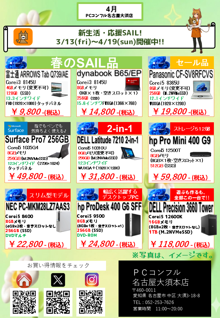 PCコンフル 名古屋大須本店 名古屋大須本店X(旧Twitter)> Instagram > Youtube > Google Map > TikTok > PCコンフルで働く > 住所 〒460-0011 愛知県名古屋市中区大須3-18-8 大須赤門ビル1階 電話番号 052-253-7626 営業時間 11:00~20:00 休業日 1月1日 名古屋大須本店のスタッフから 激安特価品をはじめ、小さなノートから高性能デスクトップまで幅広く品揃え! パソコンの「PCコンフル」! カスタマイズのご要望やどんな物がいいのかお悩みでしたら気軽にお話しください! 全力でお伺いします! 赤門通の東寄り、オレンジの看板、狐のマークが目印! 「PCコンフル名古屋大須本店」に、どうぞいらっしゃいませ! 名古屋大須本店X(旧Twitter) Tweets by pccomfullosu