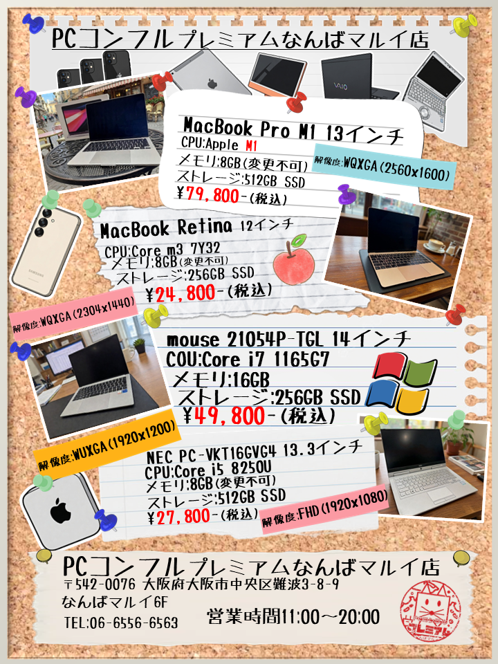 PCコンフルプレミアムなんばマルイ店では、中古のノートパソコン・デスクトップ・iPhoneやiPad・Mac・液晶モニター等幅広く商品を取り扱っております。